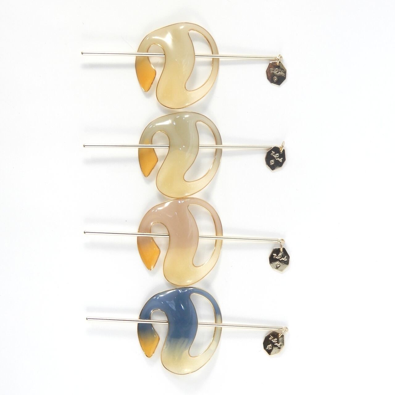 細いワイヤーで様々なモチーフを型どった枠の中に特殊な樹脂を何度も塗り重ねたアクセサリーです。質感はまるでガラスのようですが軽さが特徴