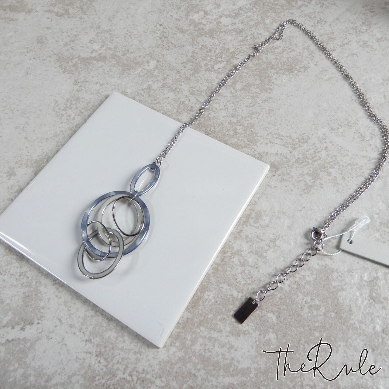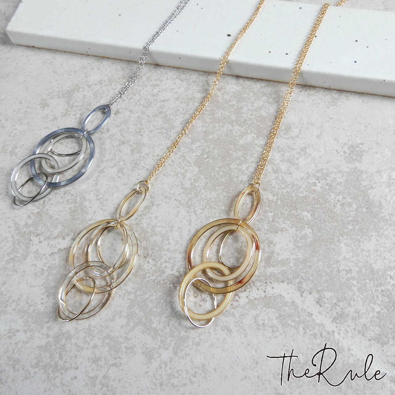 縦ラインを演出してくれるロングネックレスは、華奢なチェーンと様々なパズルリングモチーフが胸元で存在感を発揮。動くと揺れるデザインはスタイリングを華やかに彩ります。