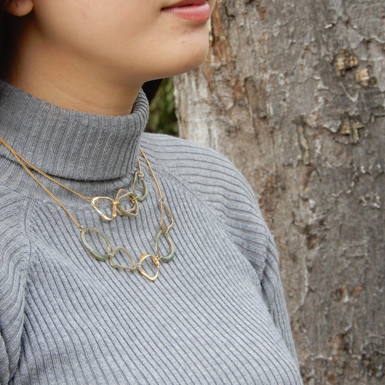 細いワイヤーで様々なモチーフを型どった枠の中に特殊な樹脂を何度も塗り重ねたアクセサリーです。質感はまるでガラスのようですが軽さが特徴