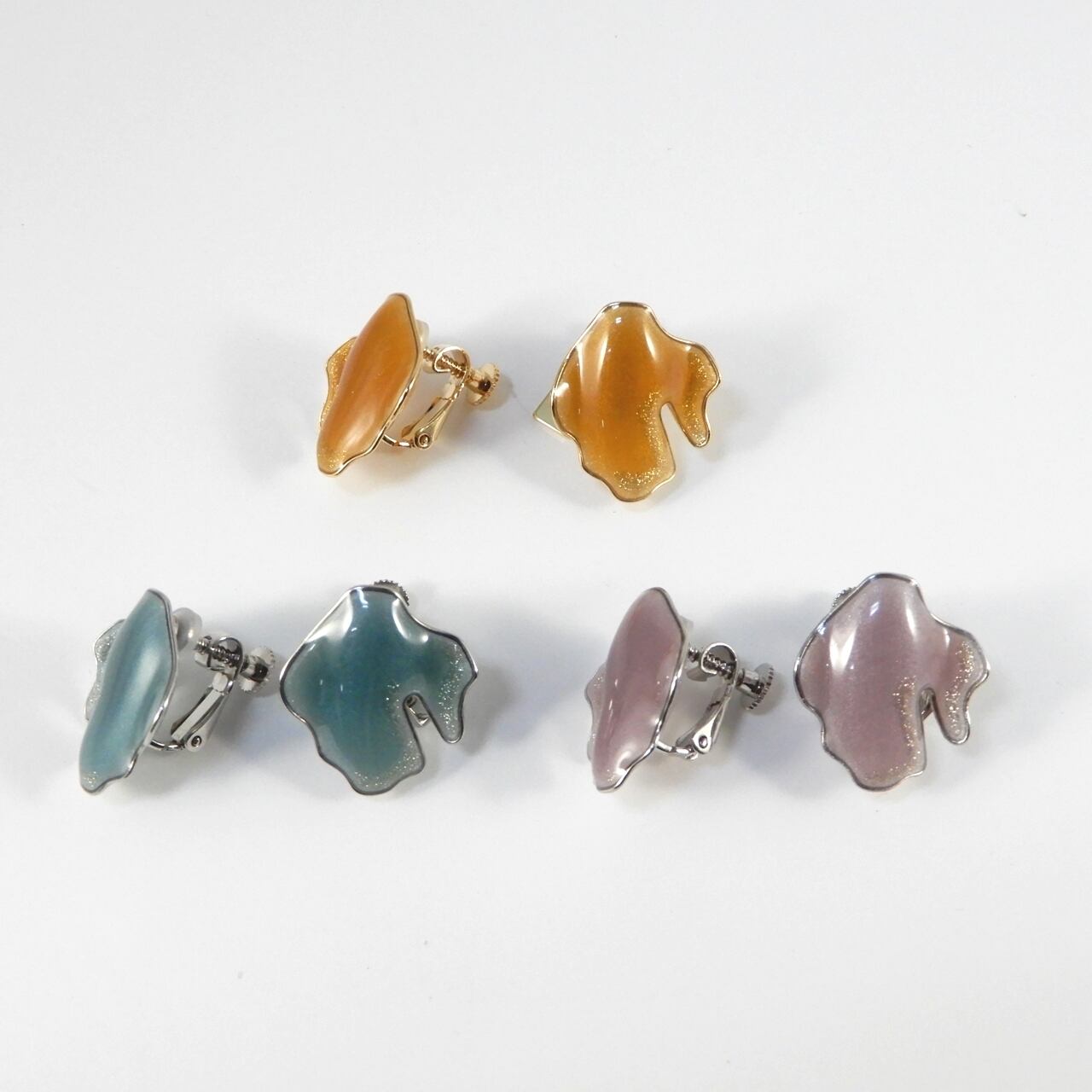 細いワイヤーで様々なモチーフを型どった枠の中に特殊な樹脂を何度も塗り重ねたアクセサリーです。質感はまるでガラスのようですが軽さが特徴