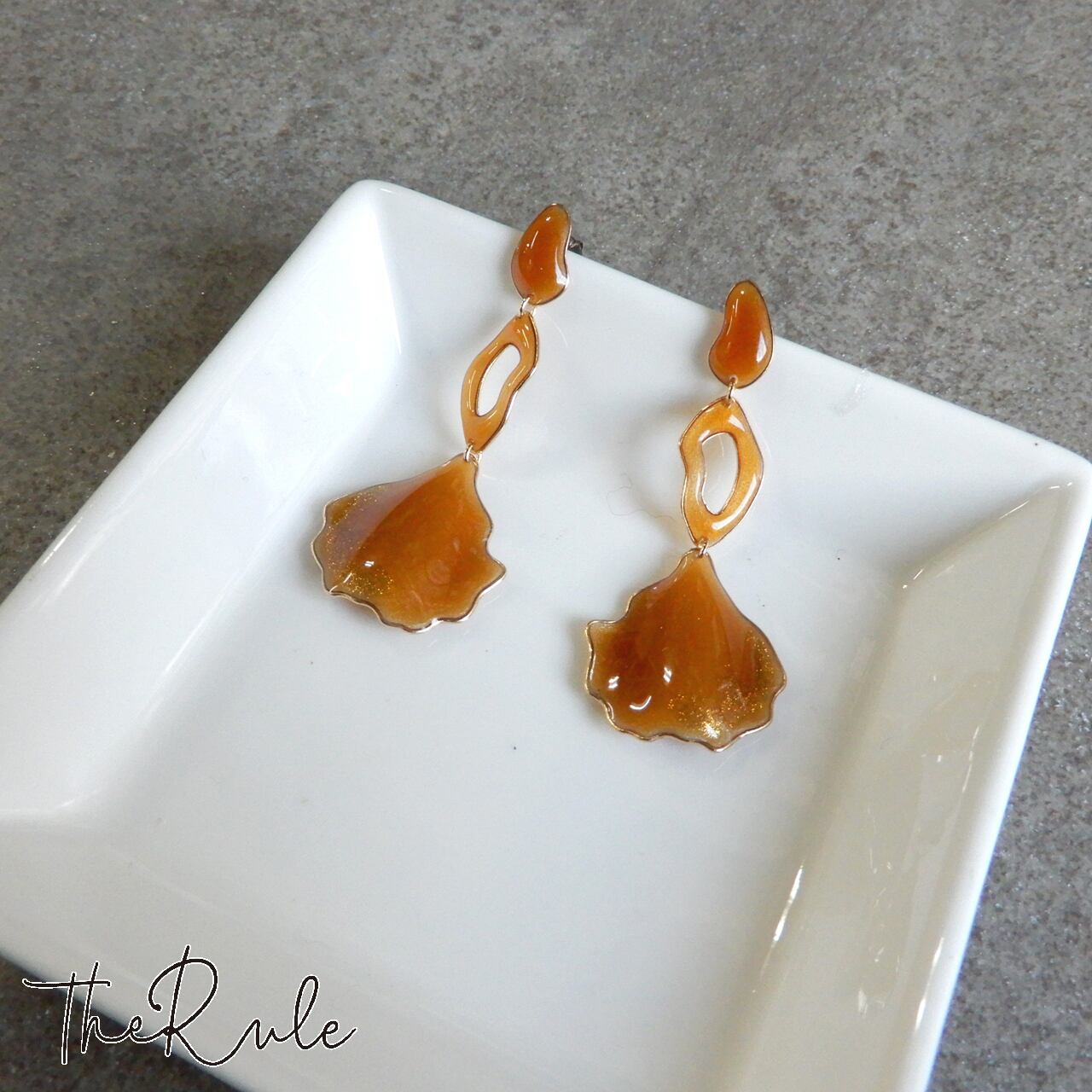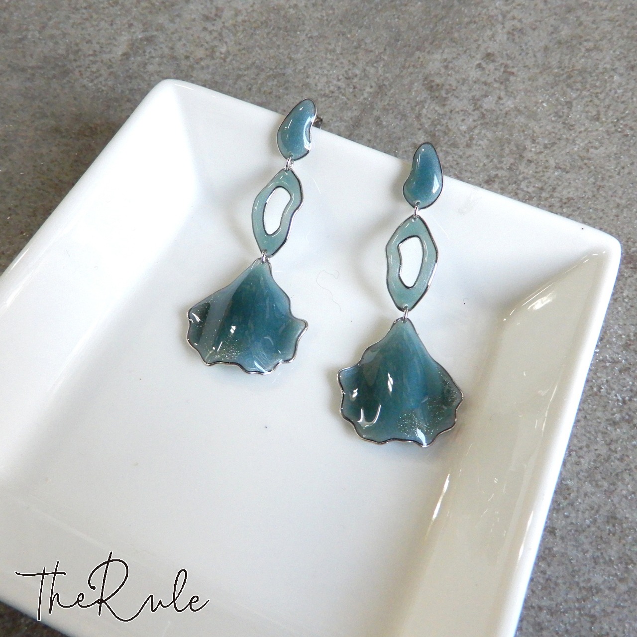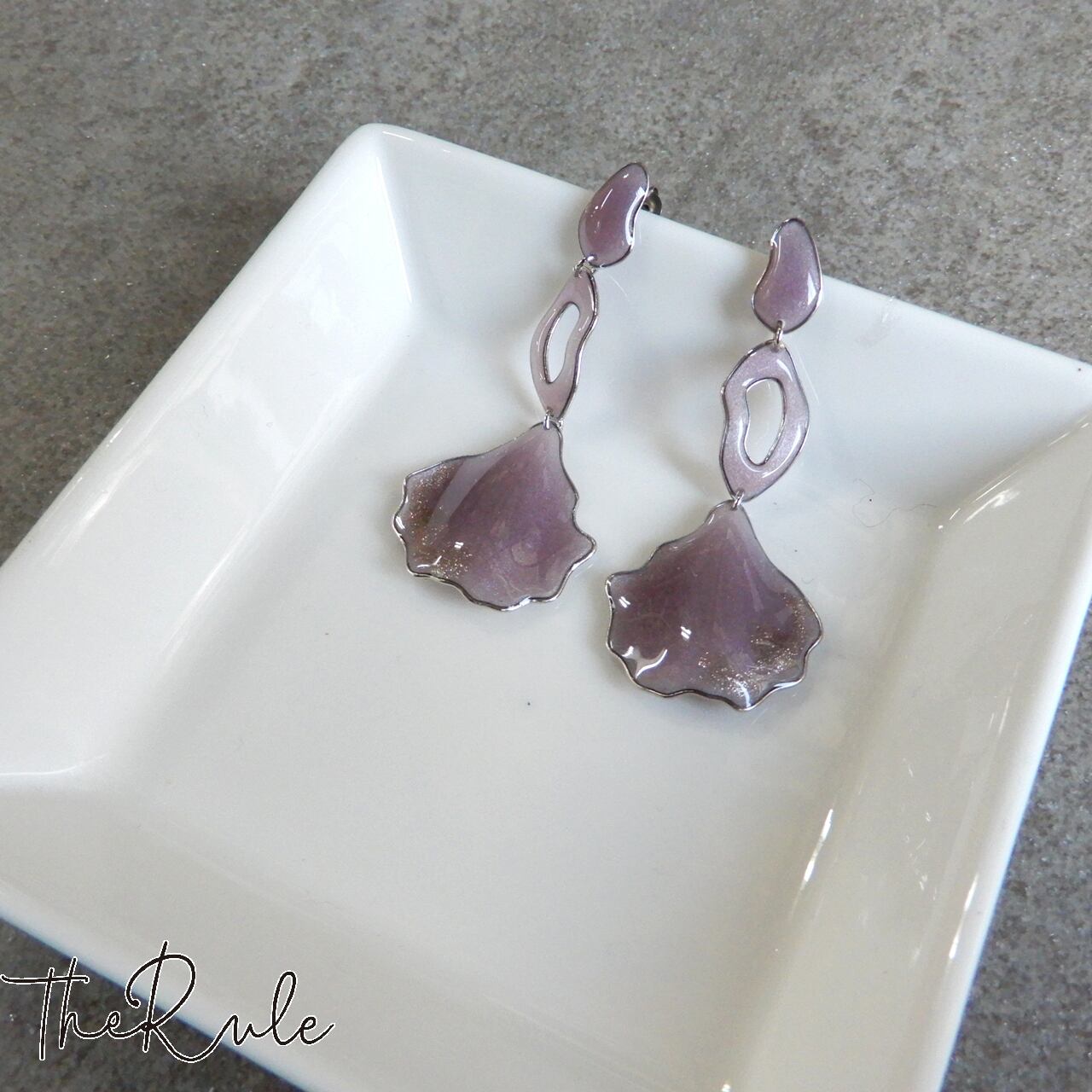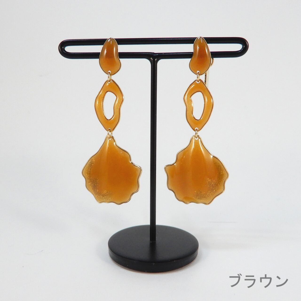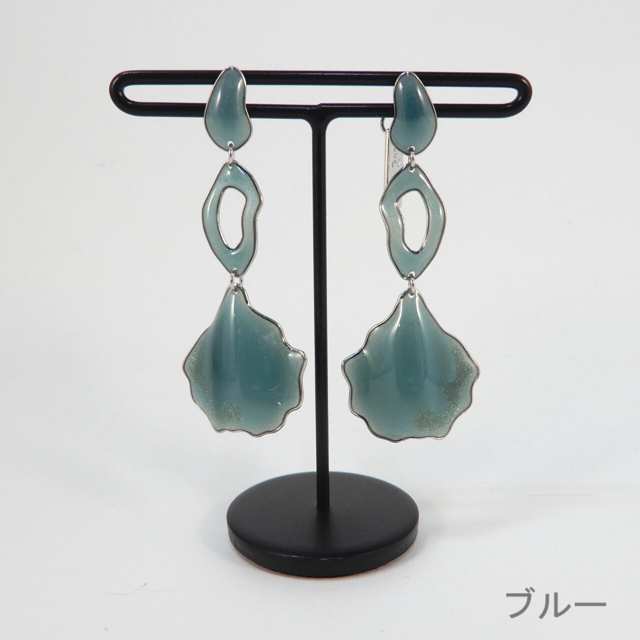 細いワイヤーで様々なモチーフを型どった枠の中に特殊な樹脂を何度も塗り重ねたアクセサリーです。質感はまるでガラスのようですが軽さが特徴