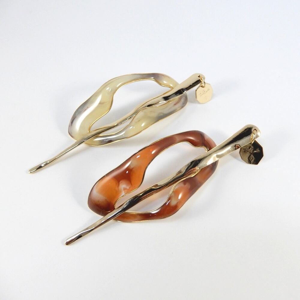 細いワイヤーで様々なモチーフを型どった枠の中に特殊な樹脂を何度も塗り重ねたアクセサリーです。質感はまるでガラスのようですが軽さが特徴