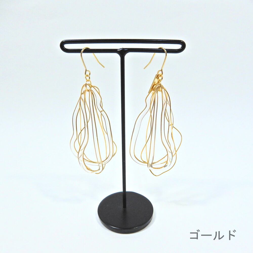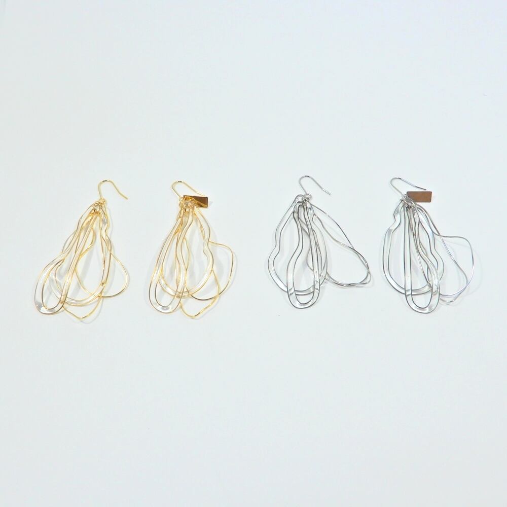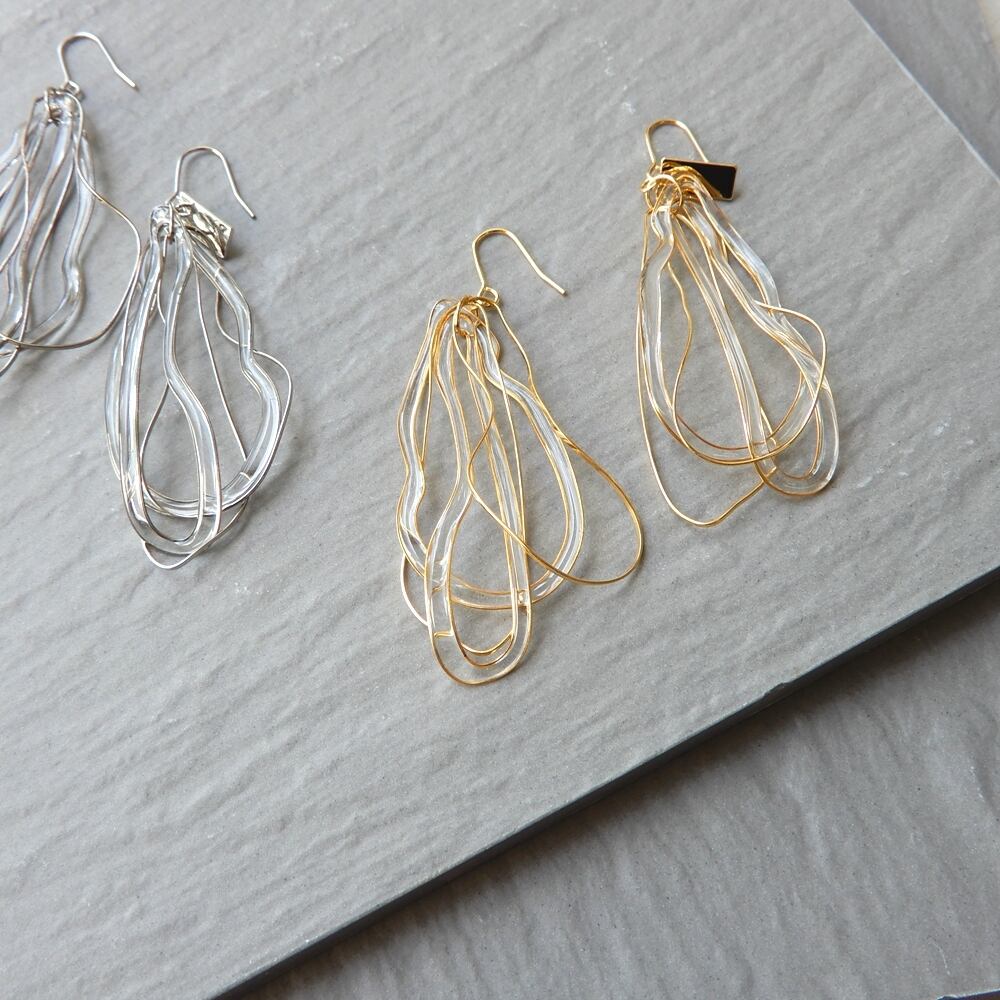 異なる素材・カタチのウエーブデザインパーツを重ね合わせた、ユニークなピアス。