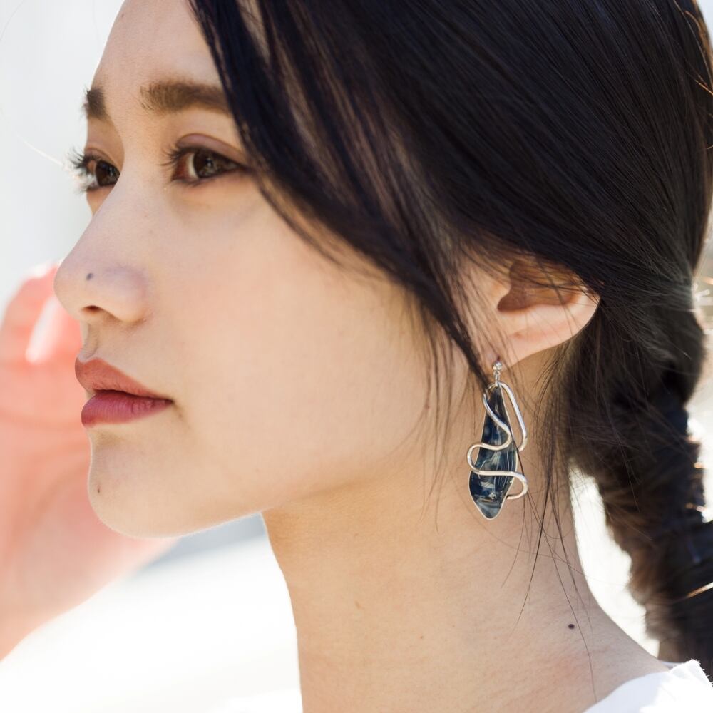 モードなスタイリングに耳元で揺れ動く姿が視線くぎづけ。